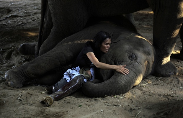 Lek Chailert sings a lullaby for PhaMai whilst another elephant watches over her